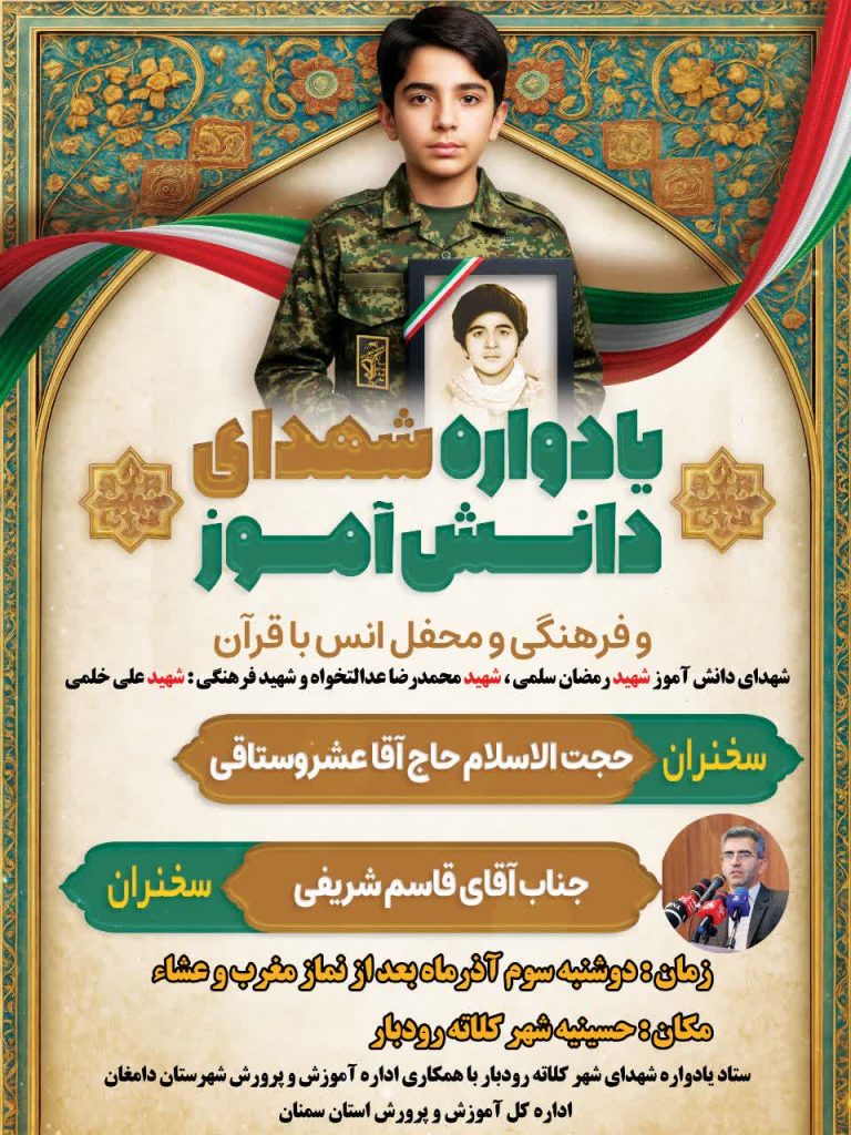 🌹هر چه امروز کشور ما دارد و هرچه در آینده به دست بیاورد به برکت خون این جوانان شهید است.🌹 🔰 دومین برنامه بیست و هشتمین یادواره شهدای شهر کلاته رودباریادواره شهدای دانش آموز ✅دوشنبه سوم آذر ماه بعد از نماز مغرب و عشامکان حسینیه سیدالشهدا شهر کلاته رودبار «ستاد یادواره شهداروابط عمومی شهرداری و […]